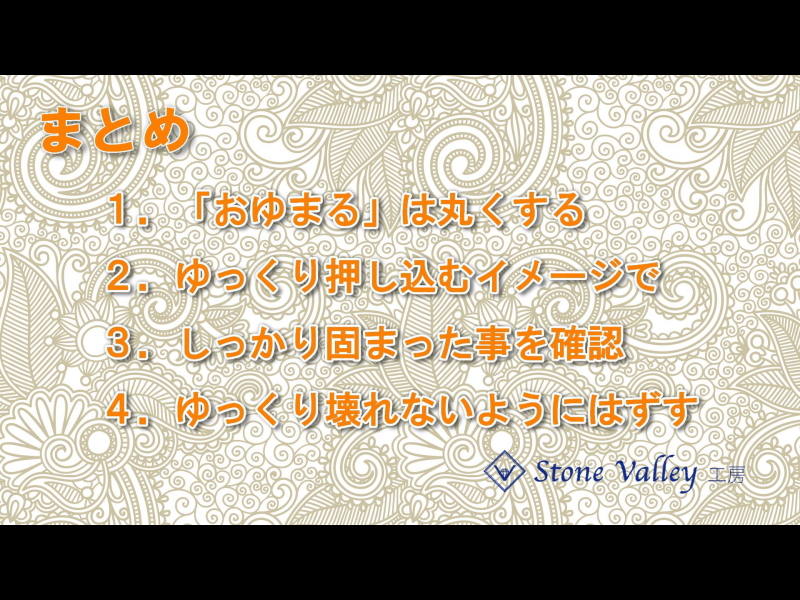 おゆまるを平べったくして鉱物に巻くと、厚みが不均一になり途中で穴が開いたり、鉱物との間に隙間が出来て気泡が入りやすくなり失敗する確率が高くなります。なので、おゆまるは必ず丸めて使用して下さい。
